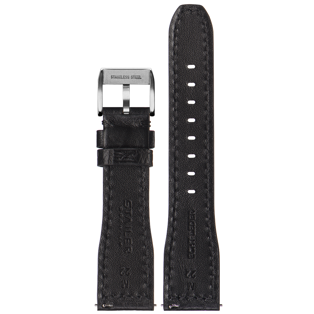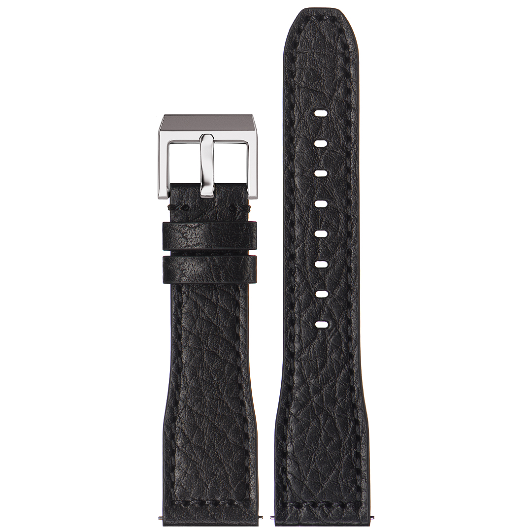 Классический ремешок STAILER серии Aviator Чёрного цвета с прострочкой в тон из обрубной натуральной кожи с тиснением под кожу Буйвола для массивных часов.